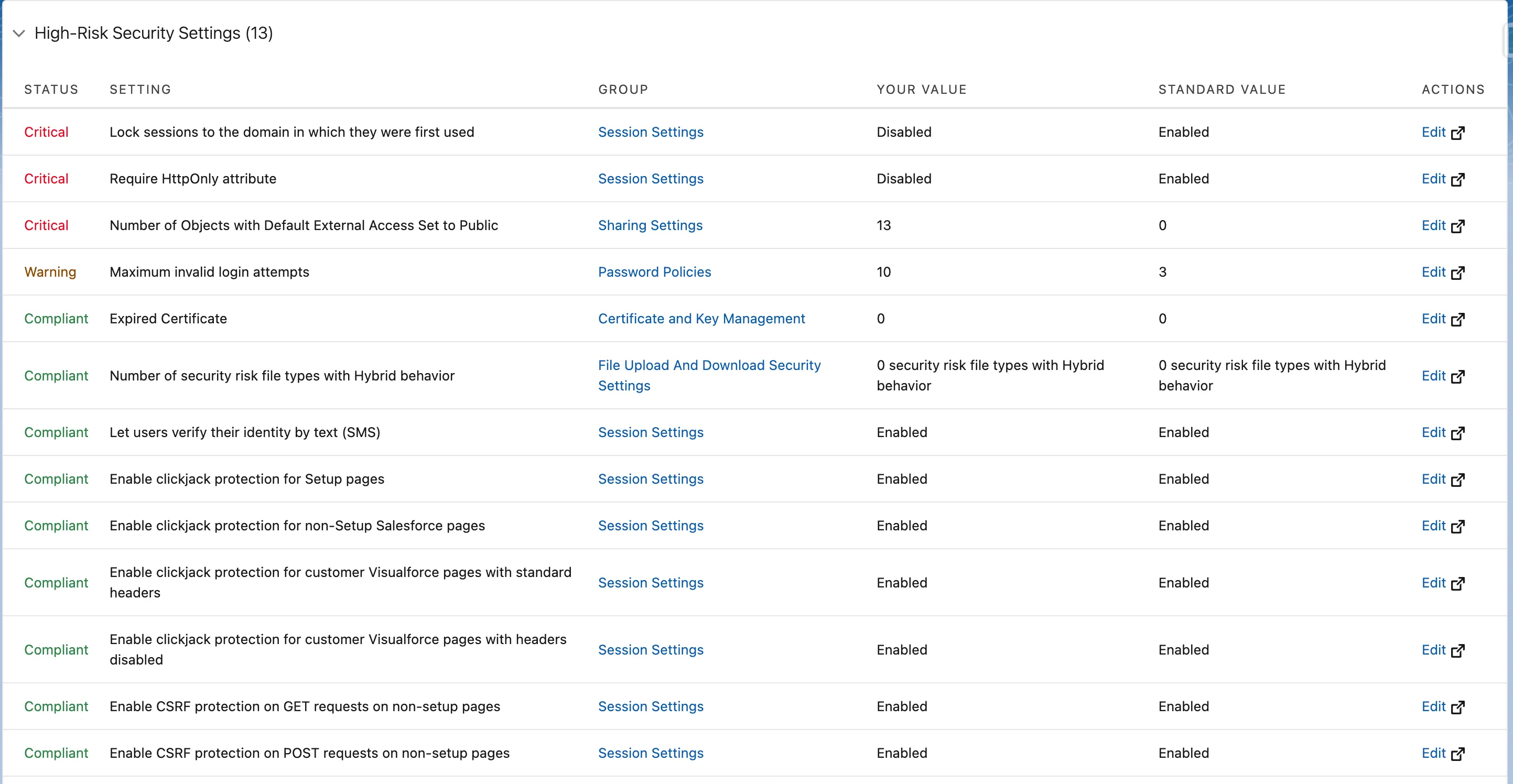 To get a better score, pay close attention to the settings listed as “Critical.” Make changes to your values as needed and wherever possible, according to the standard values listed. Do your best to address as many of the “Critical” settings as possible to improve the overall health score for your Salesforce org.