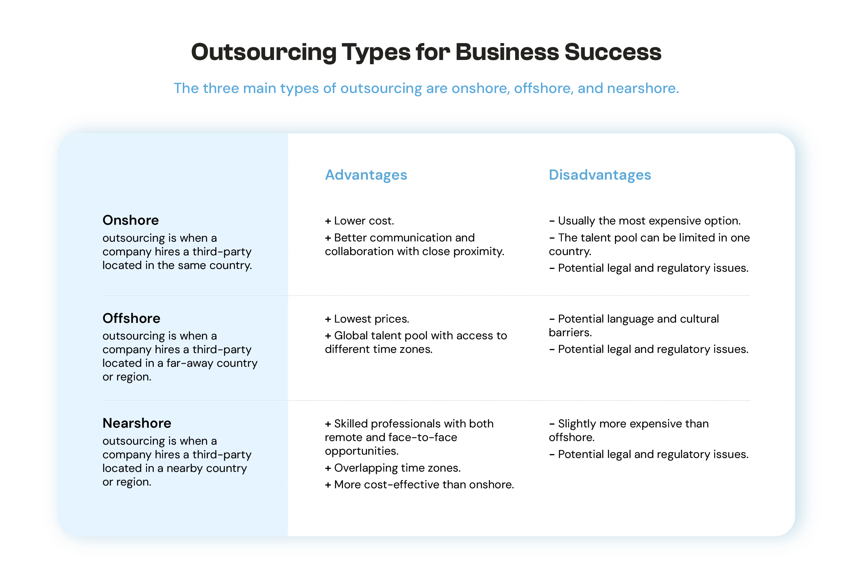 Companies should also evaluate the pros and cons of each of the three types of outsourcing and the legal implications that may arise with each of them. While outsourcing could be the perfect solution for a company, it is always crucial to follow best practices to ensure a successful outsourcing arrangement. Companies should clearly define the scope of the project, set measurable goals, and have clear communication and collaboration processes. Then, they ought to put a plan in place to handle any potential legal and regulatory issues.