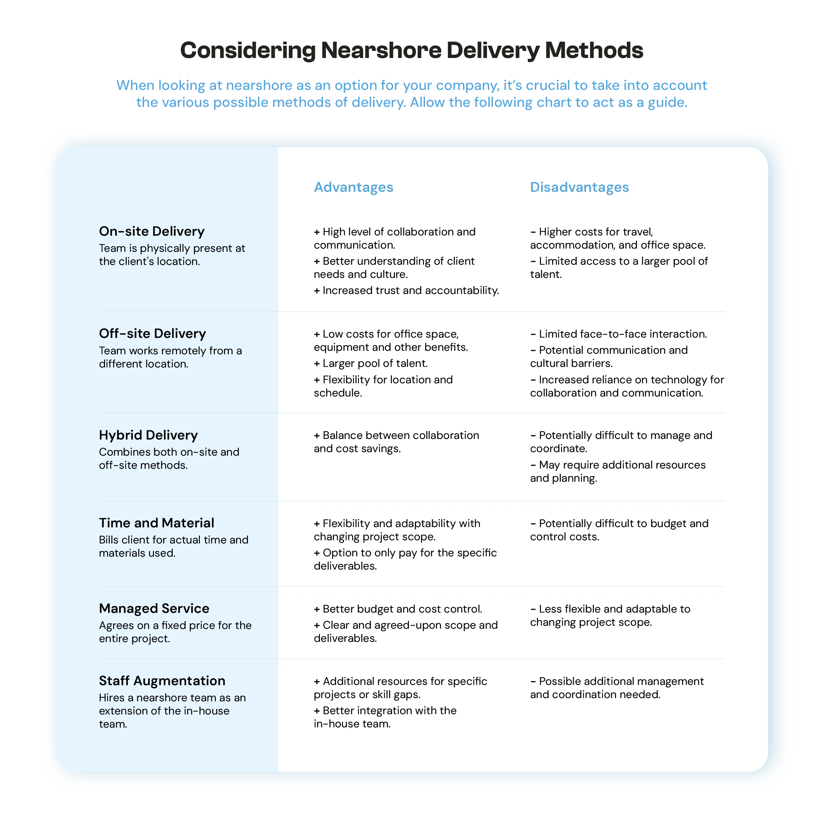 While nearshore outsourcing provides significant advantages, it also comes with multiple delivery methods, each suited to specific business needs. Ultimately, understanding the company’s goals, the scope of the project, and the desired outcomes will guide organizations toward selecting the best outsourcing model for their success.