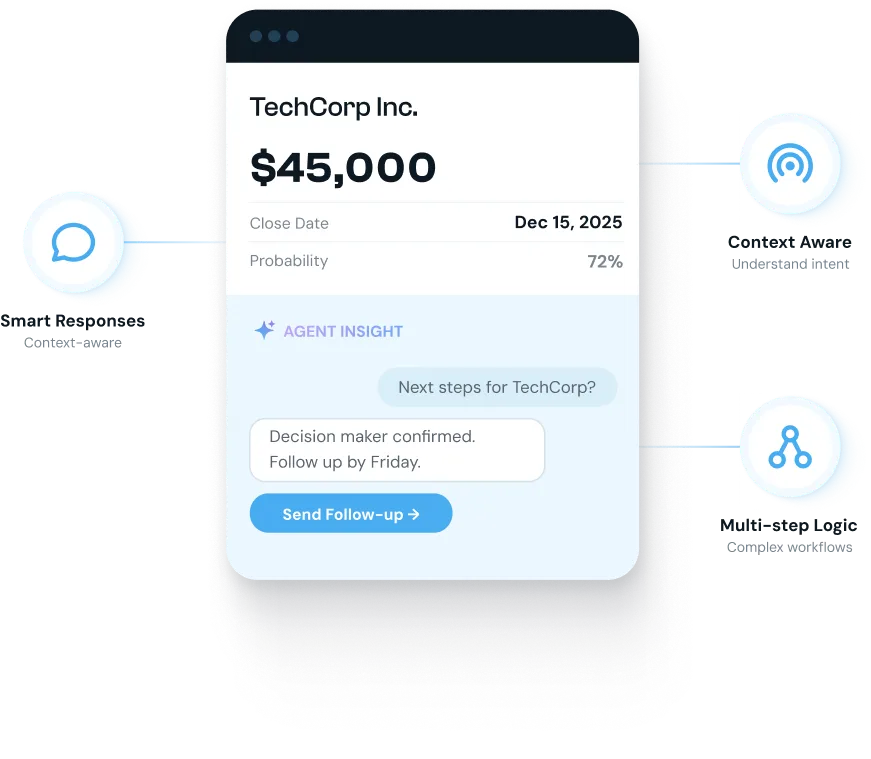 AI agents act as context-aware operators inside your Salesforce app, capable of understanding intent, taking action, and continuously improving.